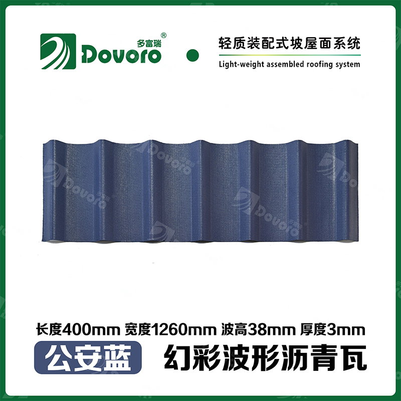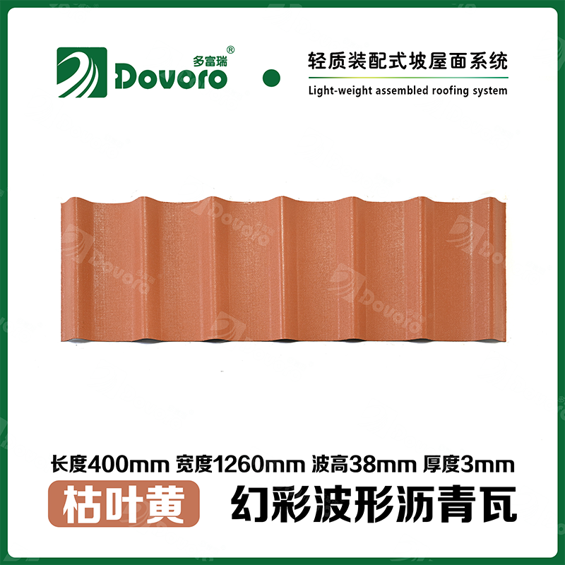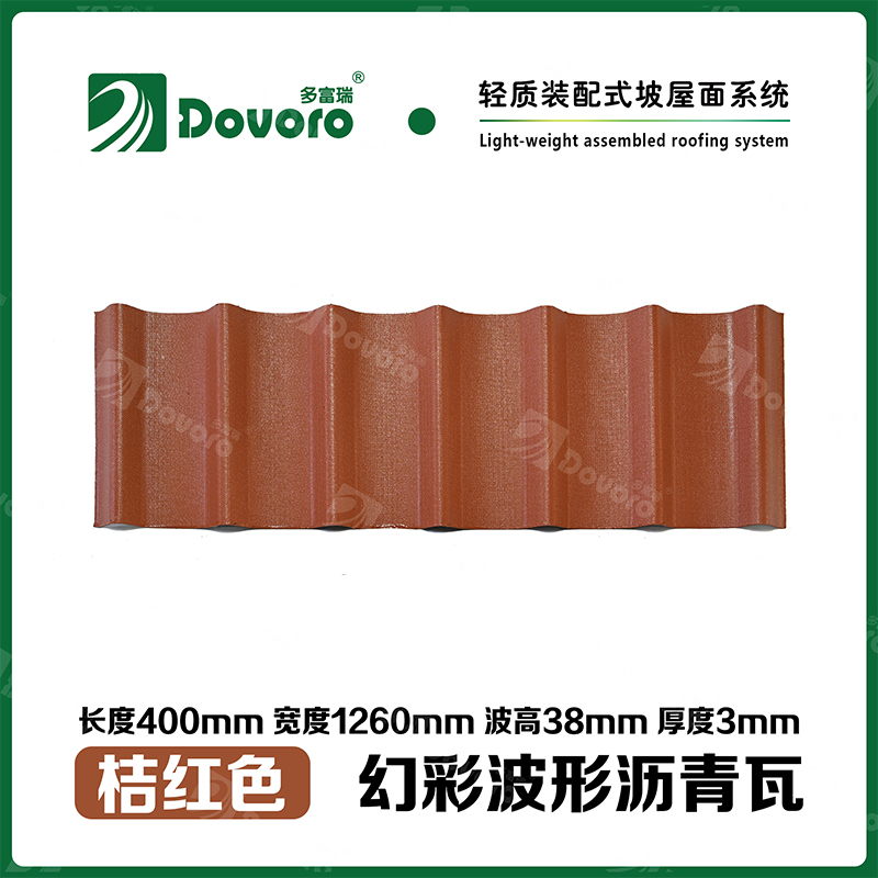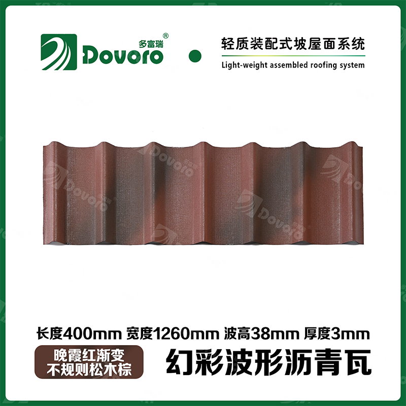 多富瑞幻彩波形瀝青瓦是由礦植物纖維板經(jīng)過整形后浸漬瀝青而成,一次成型的基層板在高溫下浸漬瀝青,使瓦材整體性更加牢固;熱固性樹脂保證了瓦材的強(qiáng)度和剛度;進(jìn)口原料配合先進(jìn)的著色工藝確保顏色持久、混色噴涂工藝使瓦材外觀高雅、色彩美觀、立體質(zhì)感。