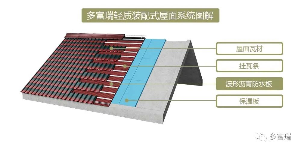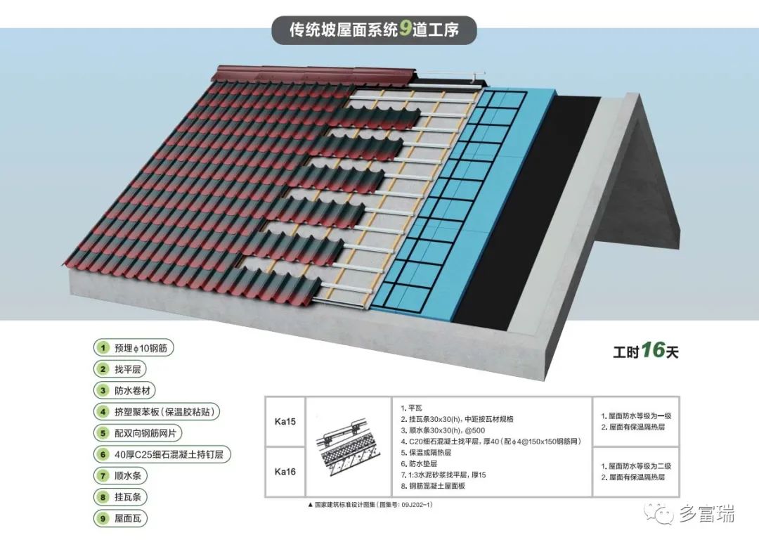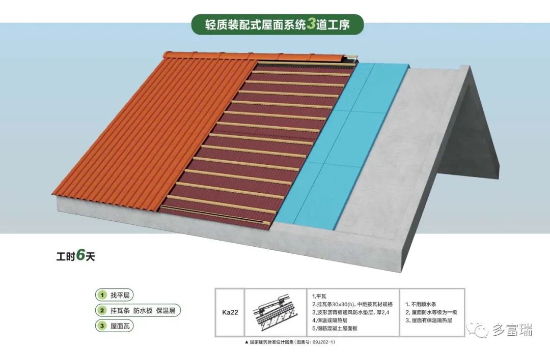 而多富瑞的輕質裝配式坡屋面系統,全部采用物理連接的方式,施工對天氣沒有要求,僅需3道工序,工期可節省一半以上,總造價可節省15%-30%。