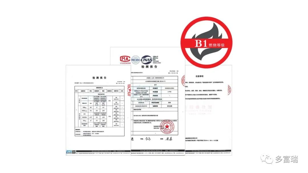 多富瑞產品符合最新的《建筑材料及制品燃燒性能分級》(GB8624-2012),B1級防火材料標準。