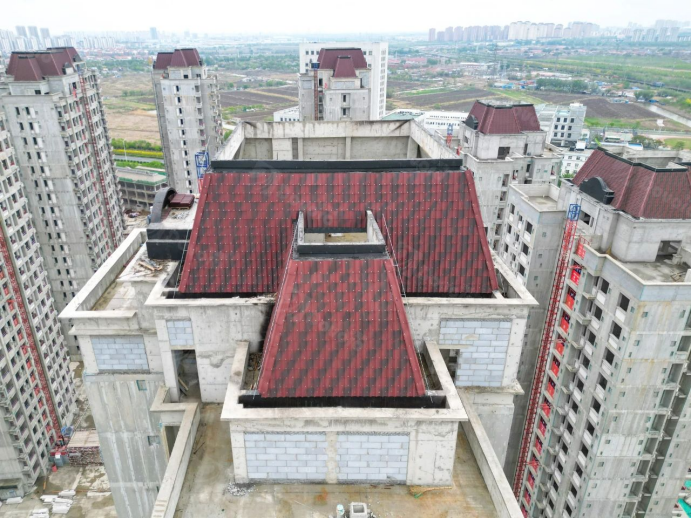本項目位于天津市津南區北閘口示范鎮,建筑面積30.82萬平方米,實現1429戶居民的“安居夢”。在本項目中,多富瑞波形瀝青瓦作為裝飾性材料,為建筑屋面增添獨特魅力。