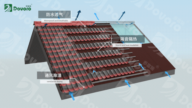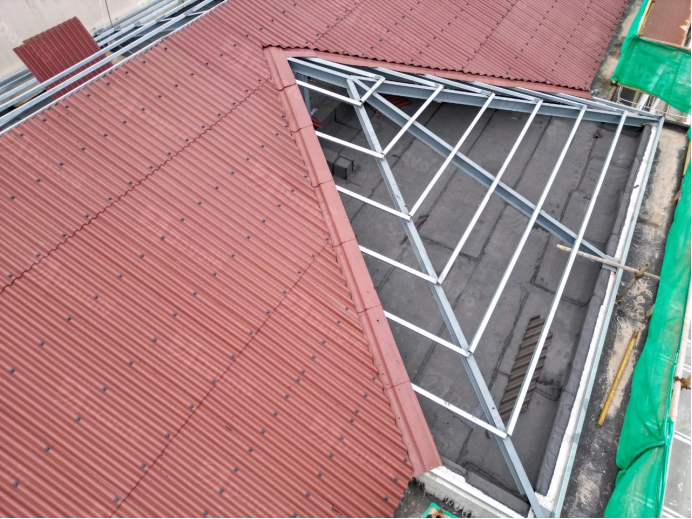 物理連接更帶來更安全的屋面環境。傳統屋面中,使用水泥砂漿作為黏合劑。長期風吹日曬會導致水泥老化脫落,造成瓦片松動掉落的危險。輕質坡屋面系統采用純物理連接,杜絕因水泥老化導致的瓦片松動脫落。