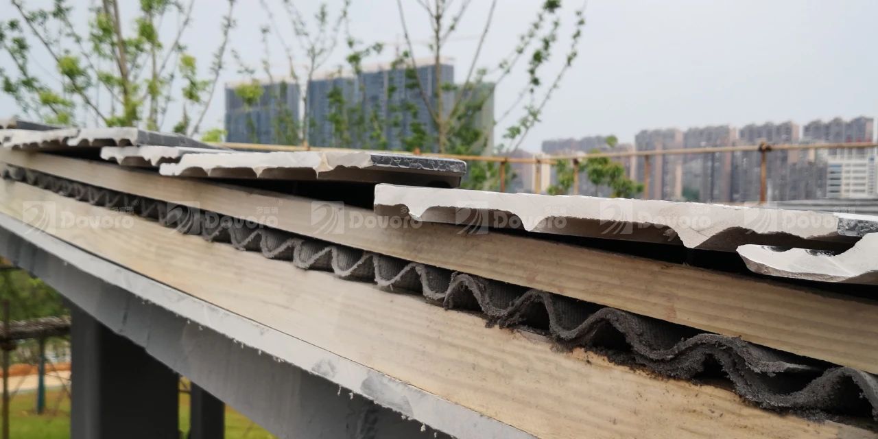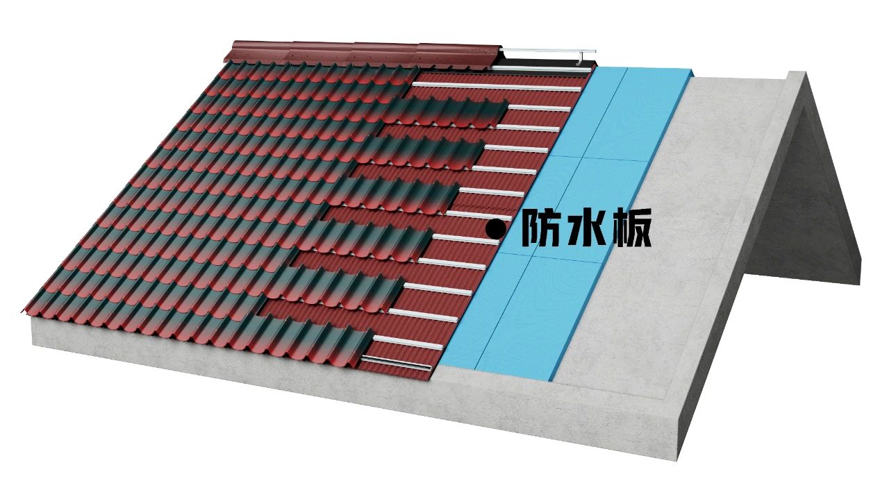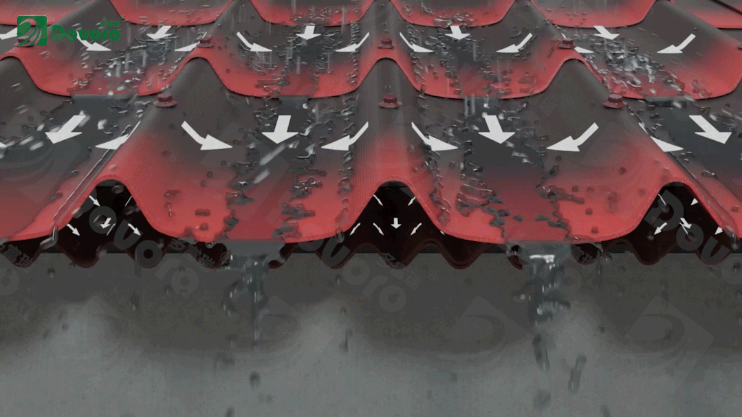 波形瀝青防水板采用了與波形瀝青瓦同樣的防排結合設計。遇到極端降雨天氣,一旦屋面瓦材發生滲漏,雨水也會順著波形瀝青防水板從上往下排出屋面,將屋面漏水的概率降至最低。