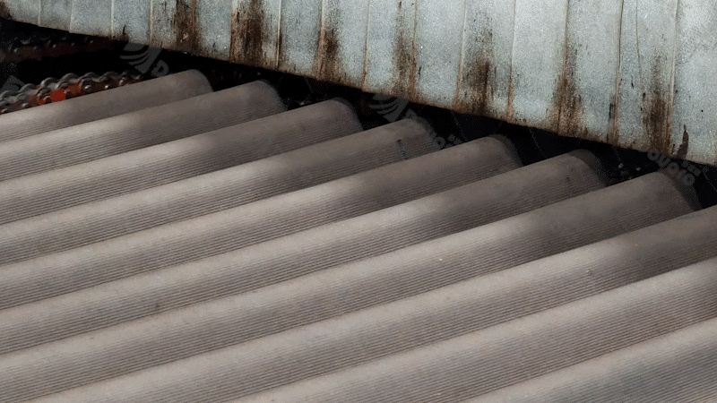 成型的波紋板會(huì)被掛到支架上,隨著傳送帶緩慢移動(dòng),進(jìn)入瀝青池,這正是它蛻變成一塊合格的瓦材最重要的一步。