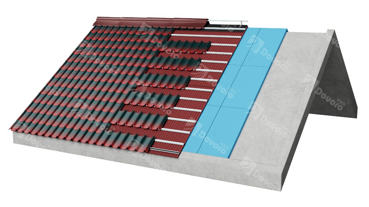 以水泥基層的屋頂為例,由下而上依次為保溫板、波形瀝青防水板、掛瓦條、波形瀝青瓦。